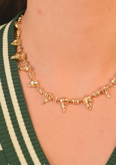 En tung, gylden kæde inspireret af konkylier og havets spiralformer. Hvert led er som et aftryk fra havets bund – organisk, taktilt og med en poetisk fornemmelse af fortid. Et smykke med styrke og ro i samme bevægelse.