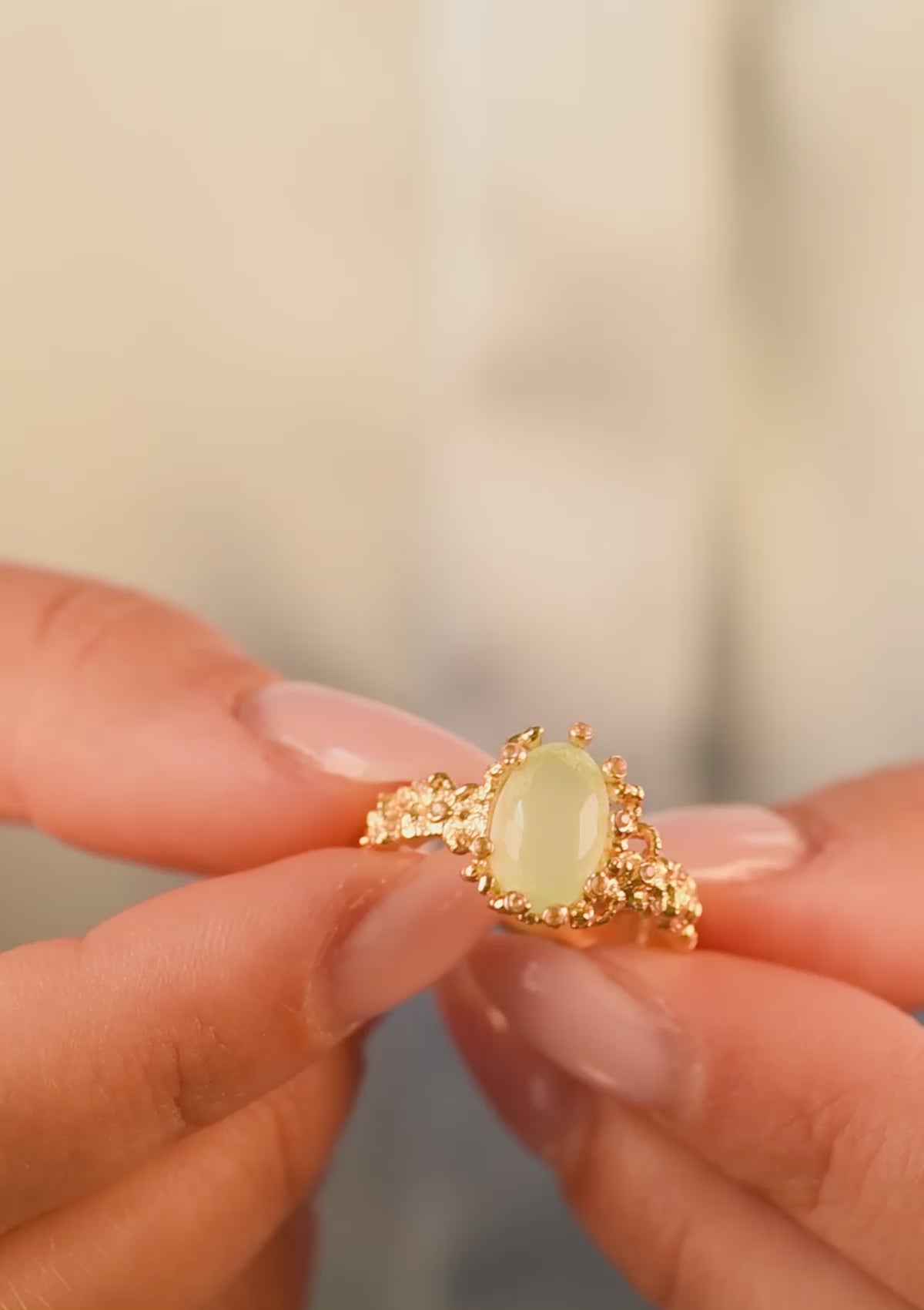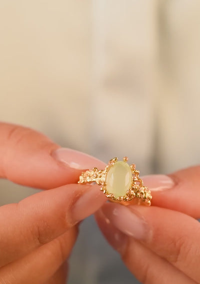 En markant cabochon af mintgrøn kalcedon, omkranset af et gyldent koralrev - Delusive Truth er inspireret af livet under havets overflade, det turkisgrønne vand & teksturen fra de kalksten koraller efterlader. Ringen er sat med 14 små nanokrystaller, der glitrer som havets overflade på en solskinsdag.
