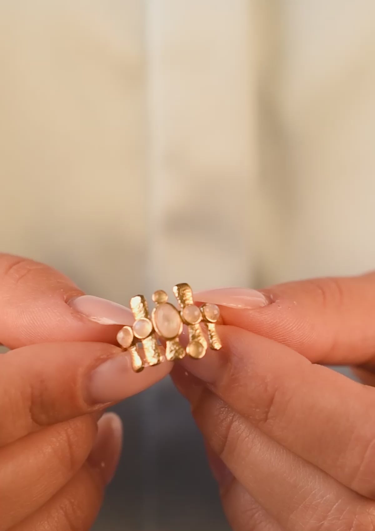 Rundede månesten, der hviler i en blød, bølgende ramme – som måneskin fanget i vandoverfladen. Moonshine Bay er et smykke med drømmende dybde og en form, der føles både naturlig og fortryllende.