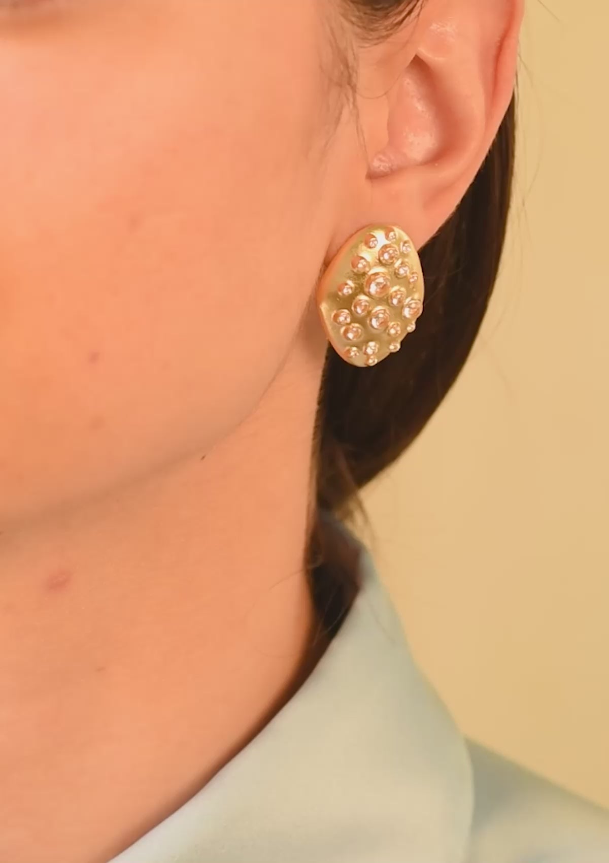 Inspireret af muslingeskaller beklædt med rurer har vi designet en ørering, der er markant såvel som elegant. Formen er simplificeret & afrundet imens rurerne er oversat til små kratere isat nanokrystaller i forskellige størrelser.