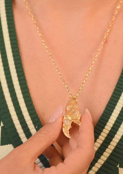Et skulpturelt smykke inspireret af en krabbens klo – råt, organisk og sat med små krystaller, der som dråber glitrer i lyset. Shellwalker er et amuletsmykke, der forener naturens rå instinkt med raffineret skønhed.