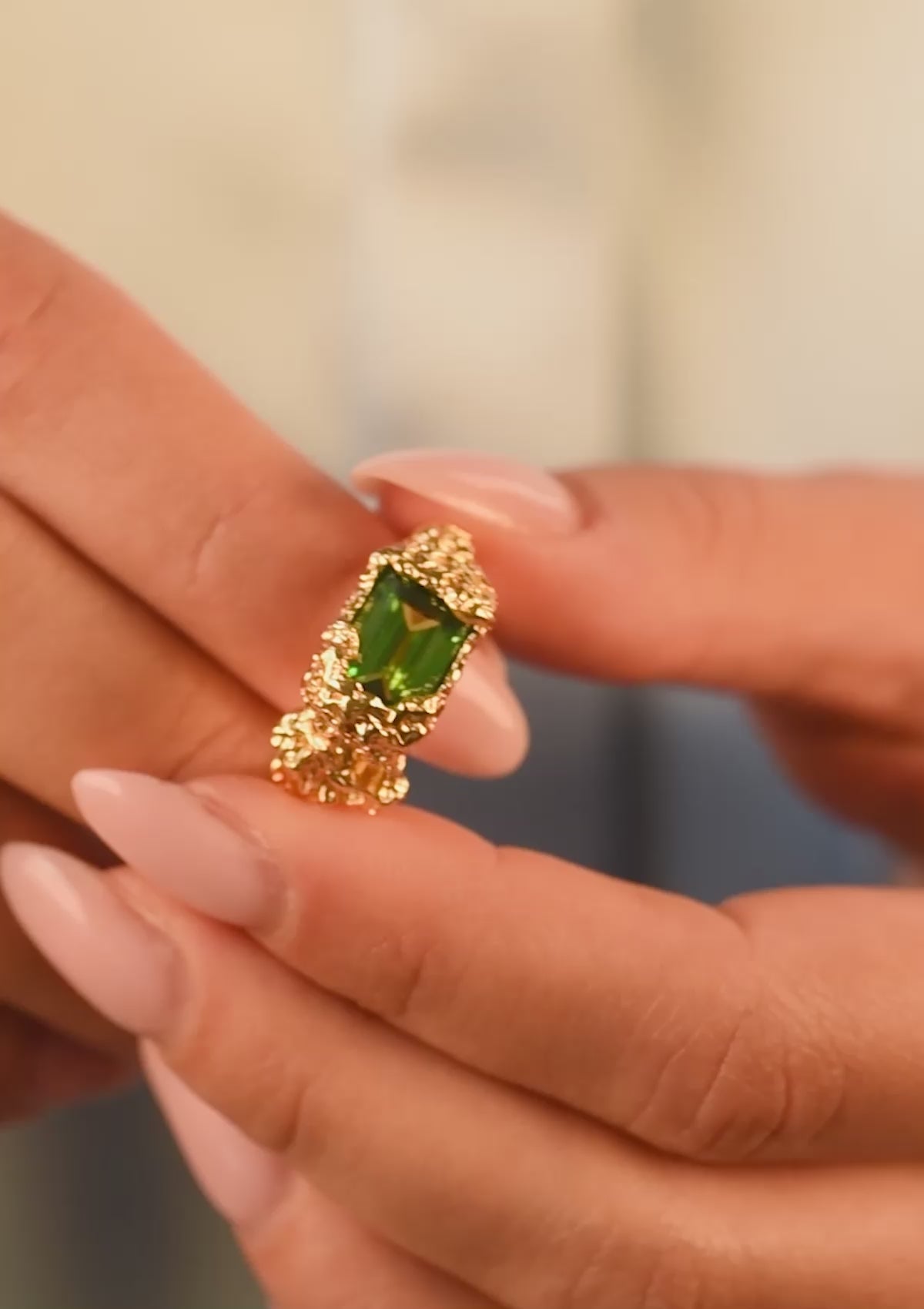 En markant ring med et organisk formsprog, der omkranser ringens hjerte - en smaragdslebet, dyb grøn krystal.