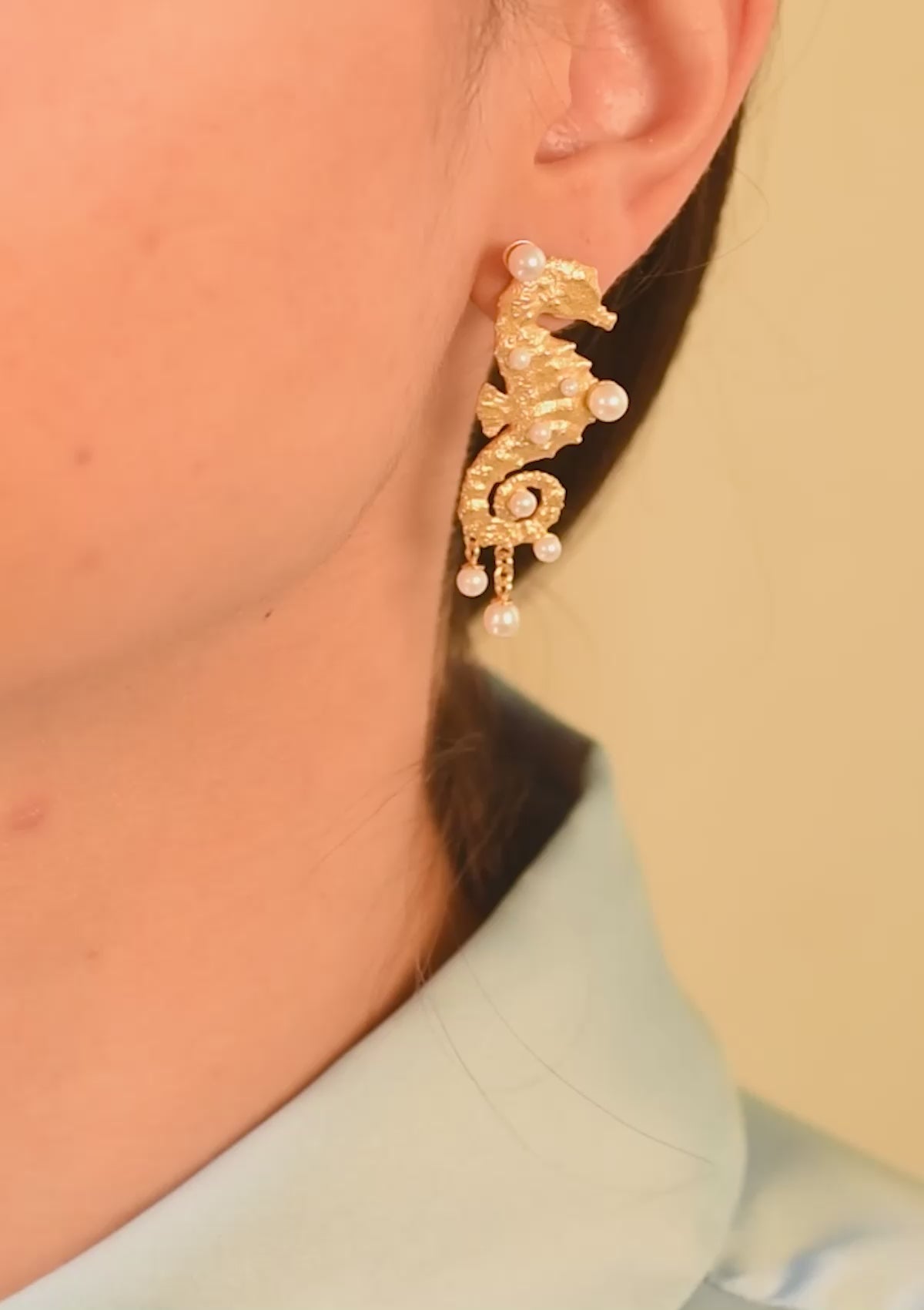 Tide Rider bærer havets rytme i sin form – og en stille styrke i sit blik. Den skulpturelle søhest er sat med hvide ferskvandsperler, som små bobler i opdrift - de svungne haler giver øreringene rytme og liv.