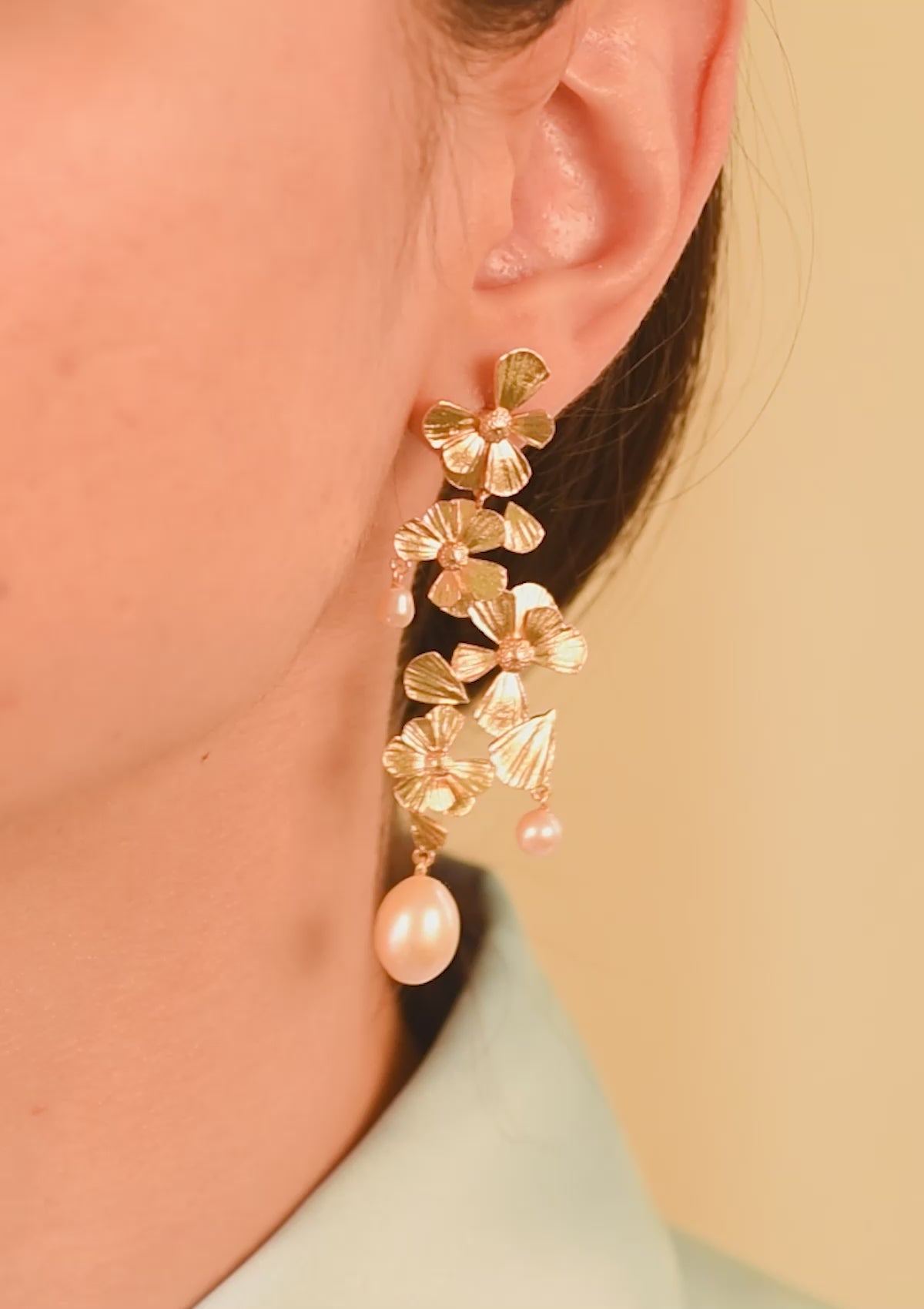 Wildflower serien er inspireret af tryllekunsten & de ikoniske blomster, der opstår af ingenting - Poetry er let & elegant, følger dine bevægelser & svajer i vinden. Hver ørering er sat med tre rosa ferskvandsperler - to dråber & en rund.